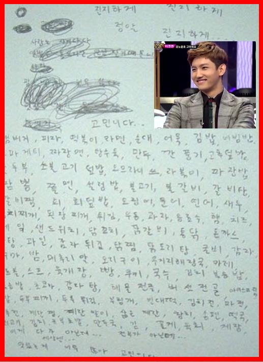 공개된 사진에는 “진지하게, 진지하게, 정말 진지하게...고민이다...”라며 “햄버거, 피자, 떡볶이, 라면, 순대, 어묵, 김밥, 비빔밥, 스파게티, 자장면, 탕수육, 만두, 깐풍기, 고추덮밥, 순두부, 소불고기 덮밥, 오므라이스, 라볶이, 자장밥, 짬뽕, 쫄면, 불고기, 갈비찜, 오징어, 문어, 김치찌개, 튀김, 우동, 과자...” 등 다양한 음식이름이 빼곡하게 적혀 있다.