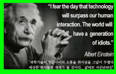 해당 게시물에는 알버트 아이슈타인이 과거 인간의 기계문명과 관련해 예언한 내용과 그에 부합하는 현실이 담겨 있는데, 60년 전 사망한 아이슈타인은 “과학기술이 인간 사이의 소통을 뛰어 넘을 그날이 두렵다. 세상은 천치들의 시대가 될 것이다”라고 예언한 것.