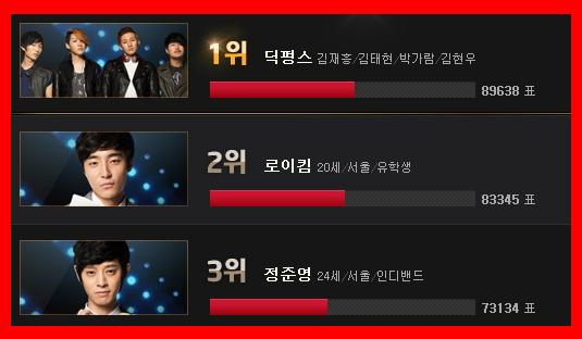 이어 로이킴이 8만3천345만표로 딕펑스보다 5천여표 뒤진 상태에서 추격을 하고 있고 정준영은 7만3천134표로 딕펑스와 로이킴과 1만표 이상의 큰 격차로 최하위를 기록했다.