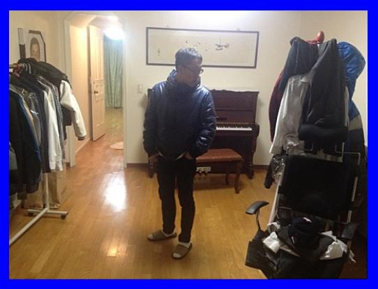 김제동 드레스룸 사진 속 김제동은 옷걸이 두 개와 피아노가 전부인 드레스룸 한 가운데서 포즈를 취하고 있다.