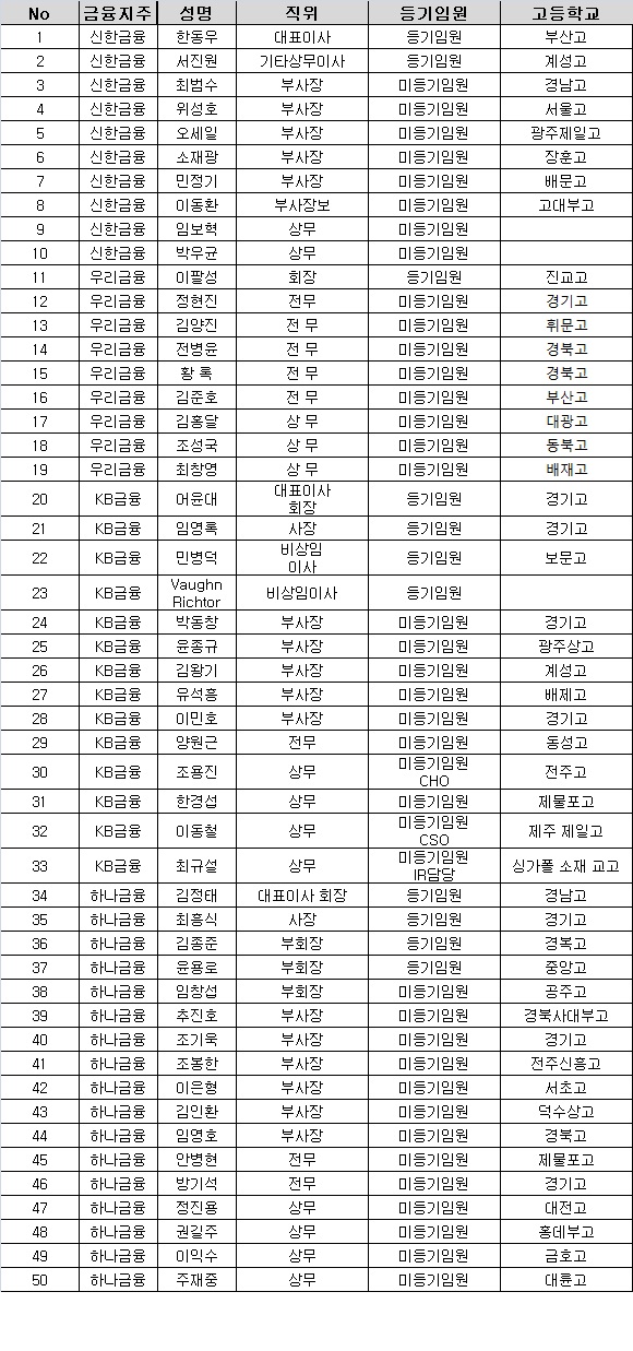 우리금융은 전체 임원 9명 중 호남지역 고등학교 졸업 임원이 한 명도 없었다. KB금융과 하나금융은 14명과 17명의 임원 중 각각 2명씩이 호남지역 고등학교를 졸업했다.