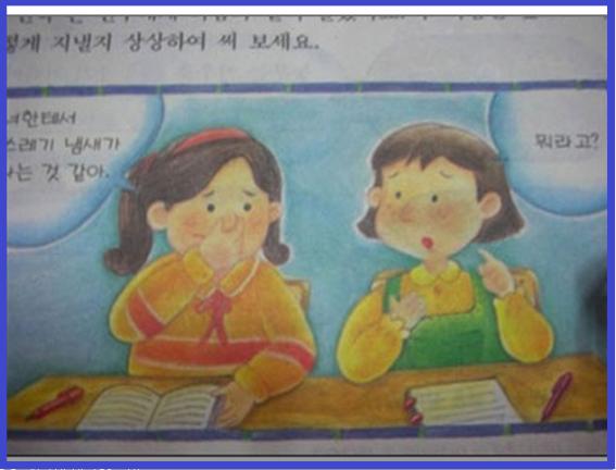 그림에는 한 여학생이 친구에게 "너한테서 쓰레기 냄새가 나는 것 같아"라고 말한다.