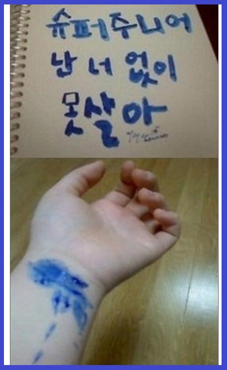 최근 한 온라인 커뮤니티 게시판에는 '엘프의 혈서'라는 제목으로 '슈퍼주니어 난 너 없이 못 살아'라는 문구가 적혀있다.