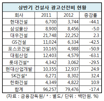 업계 1위 현대건설은 올 상반기 37억4천400만원의 광고비를 지출해 지난해 동기 67억원보다 44.1% 감소했으며 GS건설(42.5%), 롯데건설(29.5%) 등이 그 뒤를 이었다.