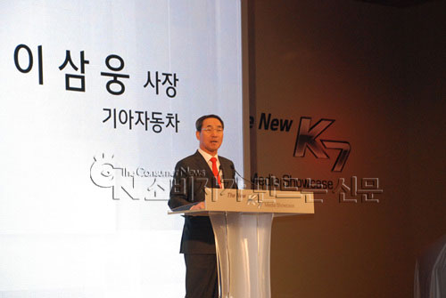 13일 서울 강남구 역삼동 리츠칼튼 호텔에서 열린 더 뉴 K7 출시행사에서 기아차 이삼웅 사장은 "더 뉴 K7은 기아브랜드의 가치 성장에 가장 큰 기여를 한 K7의 페이스리프트 모델"이라며 "차별화된 상품성과 역동감 넘치는 내외장 디자인, 합리적 가격을 모두 갖춘 더 뉴 K7은 준대형 세그먼드의 기준을 재정립할 것"이라고 설명했다.