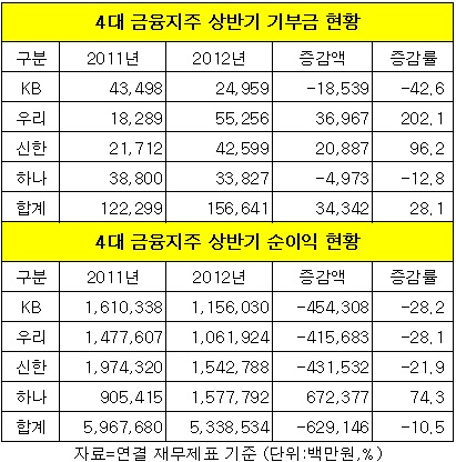 올 상반기 4대 금융지주사의 수익이 큰 폭으로 떨어졌지만 기부금 총액은 전년 동기 대비 두자릿수로 늘어나 사회적 책임이 높아졌다는 평가을 받고 있다.