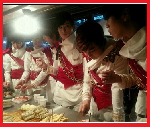 사진에는 보이프렌드 멤버들이 무대 의상을 입은 채 포장마차에서 떡볶이는 먹고 있다.