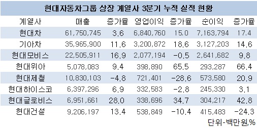 현대제철외에 현대건설(-10.4%), 현대하이스코(-2.8%), 현대모비스(-0.5%) 모두 영업이익 증가율이 마이너스를 기록하고 있다.