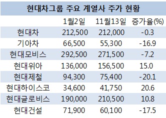 이밖에 이형근 부회장이 이끄는 기아차는 주가가 연초 대비 16.9% 하락했고, 김충호 사장의 현대차는 주가가 0.3% 떨어졌다. 현대차와 기아차의 경우 최근 미국 연비 사태가 주가 하락에 한몫했다. 현대차 김충호 사장의 임기도 내년 3월까지다.