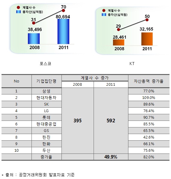 공기업이 전신인 포스코와 KT의 계열사 수 증가율이 문어발 확장으로 눈총을 받는 일반 대기업 그룹의 증가율이 2배에 달한 셈이다.