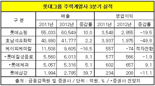 3분기 실적을 공개한 롯데쇼핑과 호남석유화학, 케이피케미칼 등 6개 계열사 가운데 롯데제과를 제외하고는 일제히 영업이익이 하락하거나 적자로 돌아서는 부진을 보인 것.