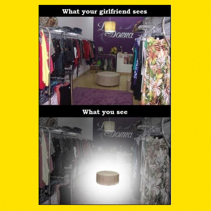 여자들은 자신이 사려고 하는 옷으로 시선이 가지만 남자들은 옷보다는 쉴 수 있는 의자부터 시선이 가 웃음을 자아낸다.