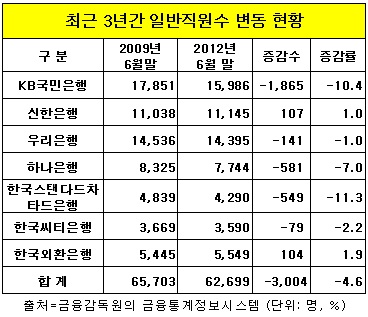 16일 금융감독원의 금융통계정보시스템에 따르면 지난 2009년 6월말부터 올해 6월 말까지 최근 3년간 7개 시중은행의 일반 직원수가 6만5천703명에서 6만2천699명으로 3천여명(4.6%) 감소한 것으로 나타났다.
