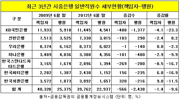 최근 3년간 일반 행원은 2만5천375명에서 2만2천937명으로 2천438명이 줄어들었다. 그러나 책임자급은 4만328명에서 3만9천762명으로 566명 감원에 그쳤다.