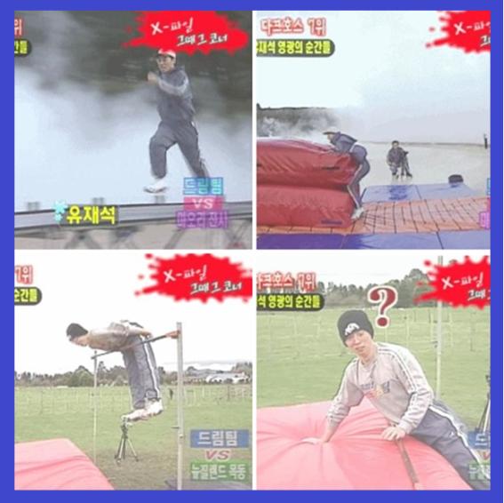 게시물에서 유재석은 높이뛰기를 하고 있지만 왠지 엉성한 모습이다.