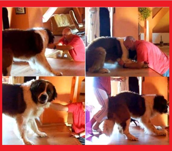 이에 주인은 개에게 먹이로 유인해보기도 하고, 엉덩이를 떠밀어봐도 어쩔 수가 없다.