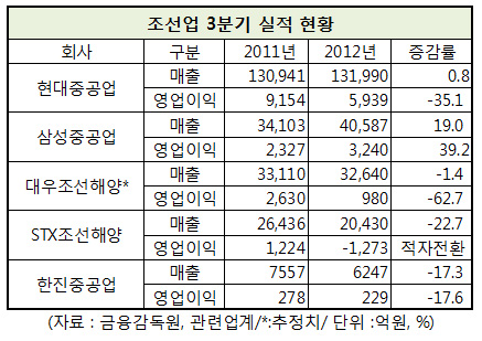 19일 금융감독원에 따르면 현대중공업과 STX조선해양, 한진중공업의 3분기 영업수지가 지난해 같은 기간에 비해 큰 폭으로 악화된 것으로 나타났다. 아직 3분기 실적을 발표하지 않은 대우조선해양도 마이너스성장이 예상된다.