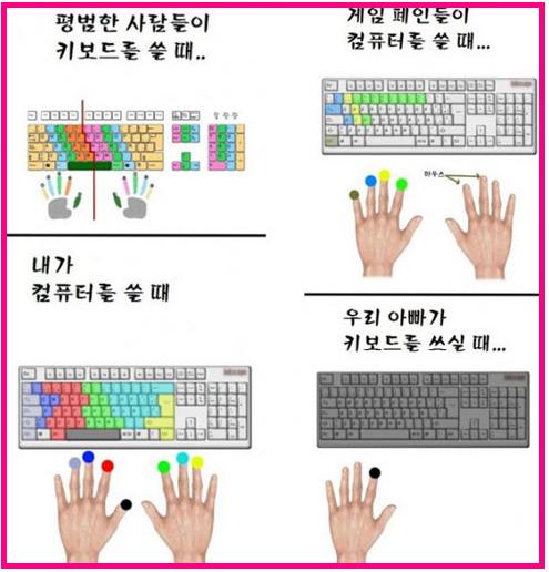 앞서 공개돼 화제가 됐던 ‘키보드 쓸 때 공감’ 게시물은 평범한 사람들, 게임 폐인들 등 4가지 부류로 나눠 키보드를 쓸 때 주로 사용하는 영역이 표시돼 있다.