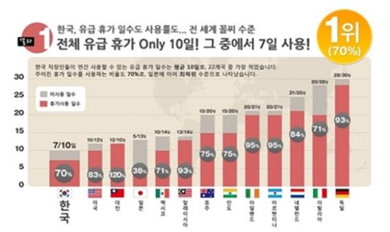 이는 13일 중 5일을 사용한 일본(38%) 다음으로 낮은 수치다. 영국, 프랑스 등 10개 국가는 주어진 휴가를 100% 다 사용했다.