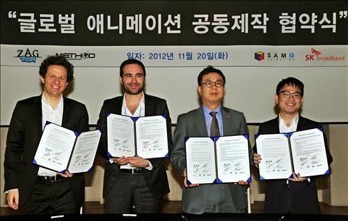이날 체결식에는 임진채 SK브로드밴드 뉴미디어사업본부장, 아통 수마슈(Aton Soumache) 메쏘드 애니메이션 대표, 제레미 자그(Jeremy ZAG) 자그툰 대표, 김수훈 삼지애니메이션 대표 등이 참석했다.