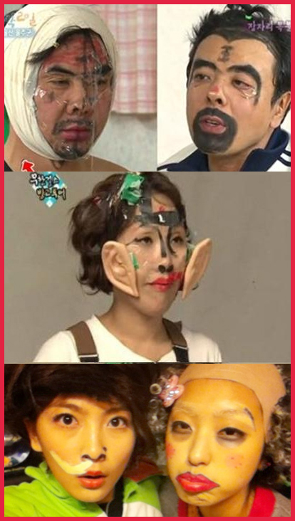 아이돌도 만만치 않았다. 강지영은 더벅머리에 콧물을, 씨스타 보라는 민머리에 주근깨를 찍어 웃음짓게 했다.