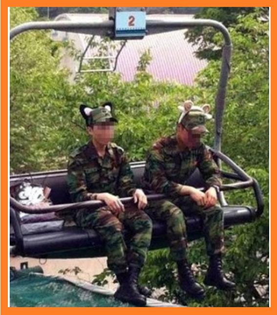 공개된 사진에는 군복을 입은 군인 커플이 머리에 동물 머리띠를 착용하고 놀이동산 리프트를 타고 있다.
