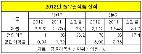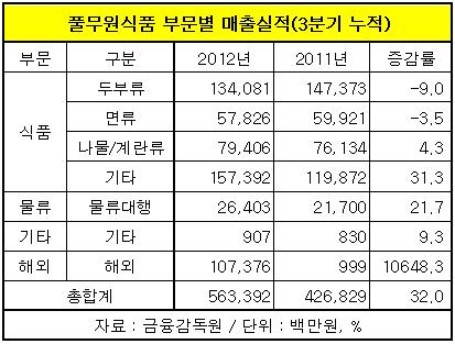 22일 금융감독원에 따르면 풀무원식품은 올 3분기 매출 2천12억원, 영업이익 78억원을 기록해 지난해 같은 기간에 비해 매출은 30%, 영업이익은 117%나 증가했다.