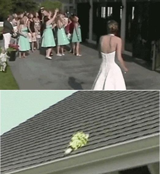 영상에는 신부가 던진 부케가 지붕 위로 올라가 있다.