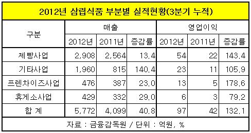 23일 금융감독원에 따르면 삼립식품은 올들어 3분기까지 누적 매출 5천772억원, 영업이익 97억원을 기록한 것으로 나타났다. 이는 지난해 같은 기간에 비해 매출은 40.8%, 영업이익은 무려 132.1% 증가한 수치다.