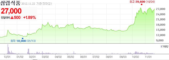 올초 1만원까지 떨어졌던 삼립식품 주가는 상반기 실적발표 이후인 지난 10월 2만9천600원까지 올랐다가 조정세를 거쳐 지난 22일 2만7천원으로 마감됐다. 올초에 기록했던 연중 최저점에 비하면 170%나 오른 수준이다.