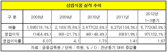 삼립식품은 지난해 매출이 6천272억원으로 전년 보다 배 이상 증가하는 폭발적인 성장을 기록했다. 영업이익도 2010년 46억원에서 89억원으로 92%나 늘었다.