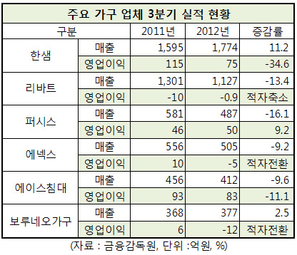 건설경기 침체로 고전하고 있는 국내 주요 가구업체들이 올 3분기에도 매출 감소와 수익성 악화에 시달렸다.