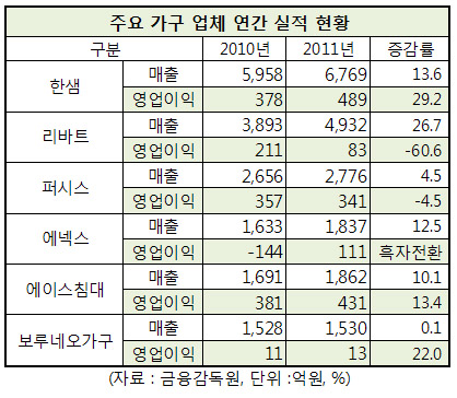 영업이익도 퍼시스가 한자릿수 성장률을 기록하고 리바트가 적자폭을 축소한 것 외에는 일제히 마이너스 성장을 기록했다.