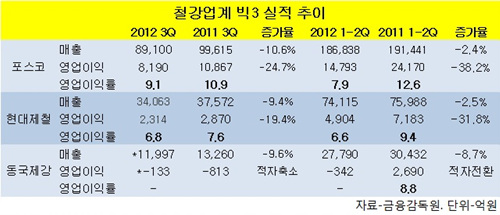 포스코(회장 정준양)와 현대제철(부회장 박승하), 동국제강(사장 김영철)은 상반기에 이어 3분기에도 매출과 수익면에서 고전하고 있다.