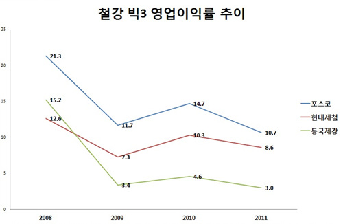 포스코의 영업이익률은 지난 2008년 21.3%에서 지난해 10.7%로 3년 만에 반토막이 났다. 같은 기간 현대제철은 12.6%에서 8.6%로, 동국제강은 15.2%에서 3%로 떨어졌다.