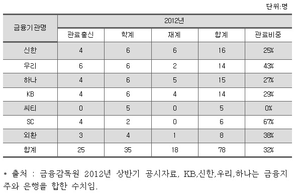 이어 KB금융(29%), 하나금융(27%), 신한금융(25%) 순이었다. 씨티은행은 관료 출신 사외이사가 없었다.