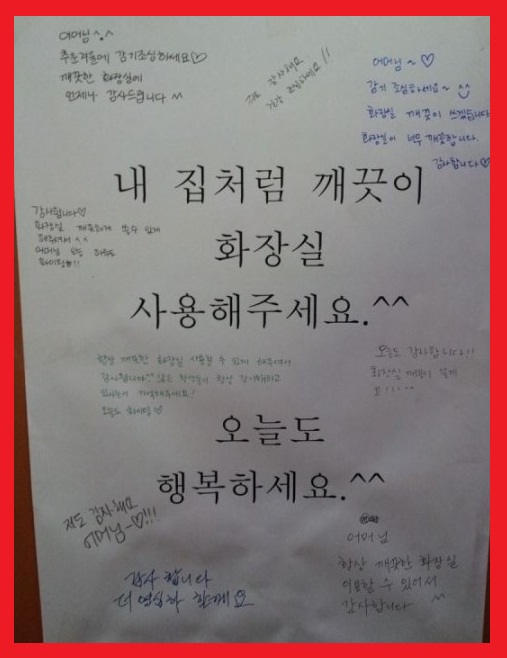 여자 화장실의 이용자들은 “추운 겨울에 감기 조심하시고 깨끗이 청소해 주셔 고맙습니다”, “오늘도 감사합니다. 열심히 살게요” 등 훈훈한 답글을 달아 놓은 것.