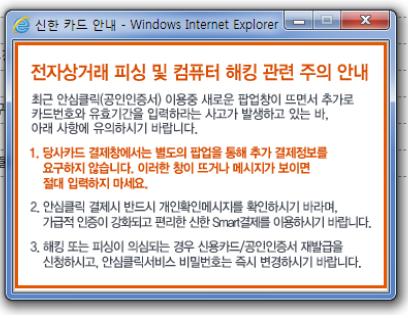 아니나다를까 홈페이지에는 안심클릭 결제창 모방 피싱(Phishing)이 급증하고 있으니 주의를 요한다는 안내문이 걸려 있었다. 하마터면 고스란히 신용카드 정보를 노출해 큰 경제적 피해를 입을 뻔 한 것.