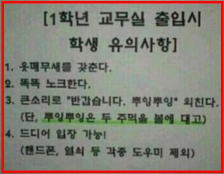 안내문에 따르면 교무실에 출입할 때는 옷매무새를 갖추고 노크를 한 뒤, 두 주먹을 볼에대고 ‘뿌잉뿌잉’ 하고 외치라 적혀있어 보는 이들을 폭소케 한다.