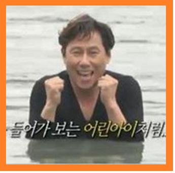 윤종신의 다소곳하게 주먹을 꼭 쥐고 얼굴을 물 밖으로 내 놓은 채 겨울바다에 입수하는 모습에 멤버들은 폭소했다. (사진-KBS)