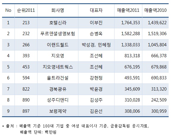 국내에서 여성CEO가 경영을 맡고 있는 기업으로는 삼성그룹 이건희 회장의 장녀 이부진 사장이 맡고 있는 호텔신라가 213위로 가장 높은 순위를 보였고 국내 최고의 전문경영인으로 꼽히는 손병옥 대표가 키워낸 푸르덴셜생명보험이 232위로 그 뒤를 이었다.