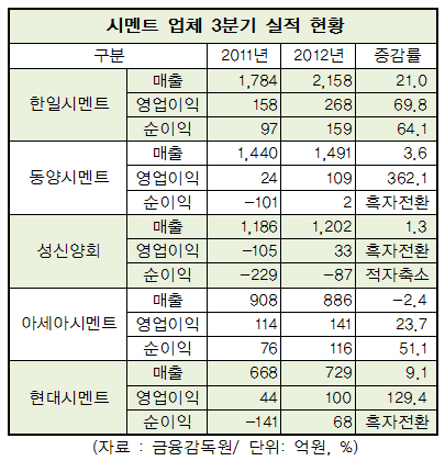 27일 금융감독원에 따르면 최근 3분기 실적을 발표한 한일시멘트와 동양시멘트, 성신양회, 아시아시멘트, 현대시멘트는 지난해 같은 기간에 비해 영업이익을 두자릿수로 늘리며 실적 호조를 이어갔다.