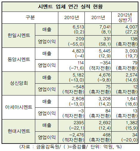 시멘트 업체들은 건설 경기침체로 인해 지난 2010년까지 실적 부진에 시달렸으나 시멘트 단가 인상에 힘입어 매출과 영업이익이 큰 폭으로 개선되고 있다.