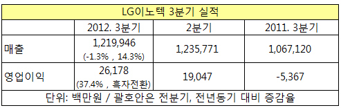 LG이노텍은 올 3분기 매출 1조2천199억원, 영업이익 262억원을 기록했다. 매출은 2분기 1조2천357억원에 비하면 1.3% 감소했지만 영업이익은 190억원 보다 37.4% 급증했다.
