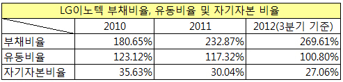 특히 심각한 것은 부채비율이다. LG이노텍의 올 3분기 부채비율은 269.61%로 최근 3년간 가장 높은 수준이다. 작년 보다는 36.74%포인트, 재작년보다는 88.96% 포인트나 높아졌다.