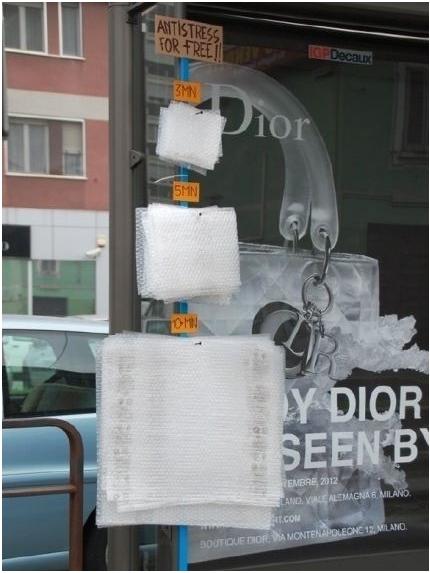특히 버스정류장에서는 '무료 스트레스 풀기'라는 문구 아래 여러가지 크기의 에어캡이 매달려 있다.