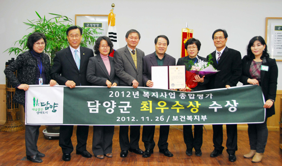 담양군(군수 최형식)은 보건복지가족부가 전국 232개 기초자치단체를 대상으로 실시한 2012년 지방자치단체 복지정책 평가에서 ‘복지사업 종합평가’ 분야 최우수기관으로 선정돼 3천만원의 특별지원금을 받았다고 27일 밝혔다.