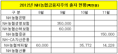 지난 8월 NH농협캐피탈에 600억 원을 출자한데 이어 9월에는 보험사 2곳의 유상증자(손보 600억원, 생보 3천500억원)에만 총 4천100억원을 출자했다. 10월에는 NH농협캐피탈이 500억원 규모의 유상증자 중 357억7천200억원을 출자했고, 11월에는 실권주 142억2천800억원까지 인수했다.