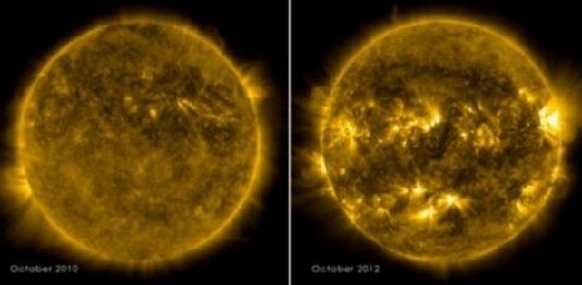 사진 속 태양의 두 얼굴을 보면 지난 2010년의 경우 태양 극소를 보이고 있지만 2012년 이후 활발해지고 있다.