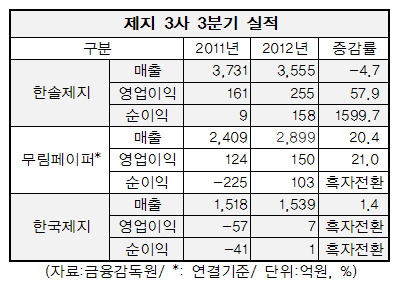 29일 금융감독원에 따르면 한솔제지와 무림페이퍼, 한국제지는 올 3분기 영업이익과 순이익이 지난해 같은 기간에 비해 크게 증가했다.